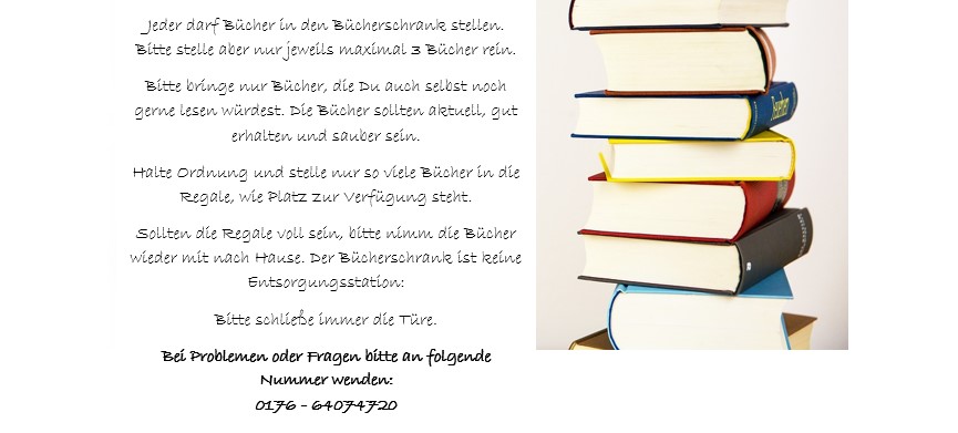 Jeder darf dort Bücher einstellen oder entnehmen. Egal ob Kinder, Jugendliche oder Erwachsene. Auch eine kleine Tausch-Ecke für Spiele ist geplant.