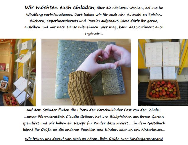 In den nächsten Wochen könnt ihr ein Stück Kindergarten mit zu Euch nach Hause nehmen. Alle Details hier: