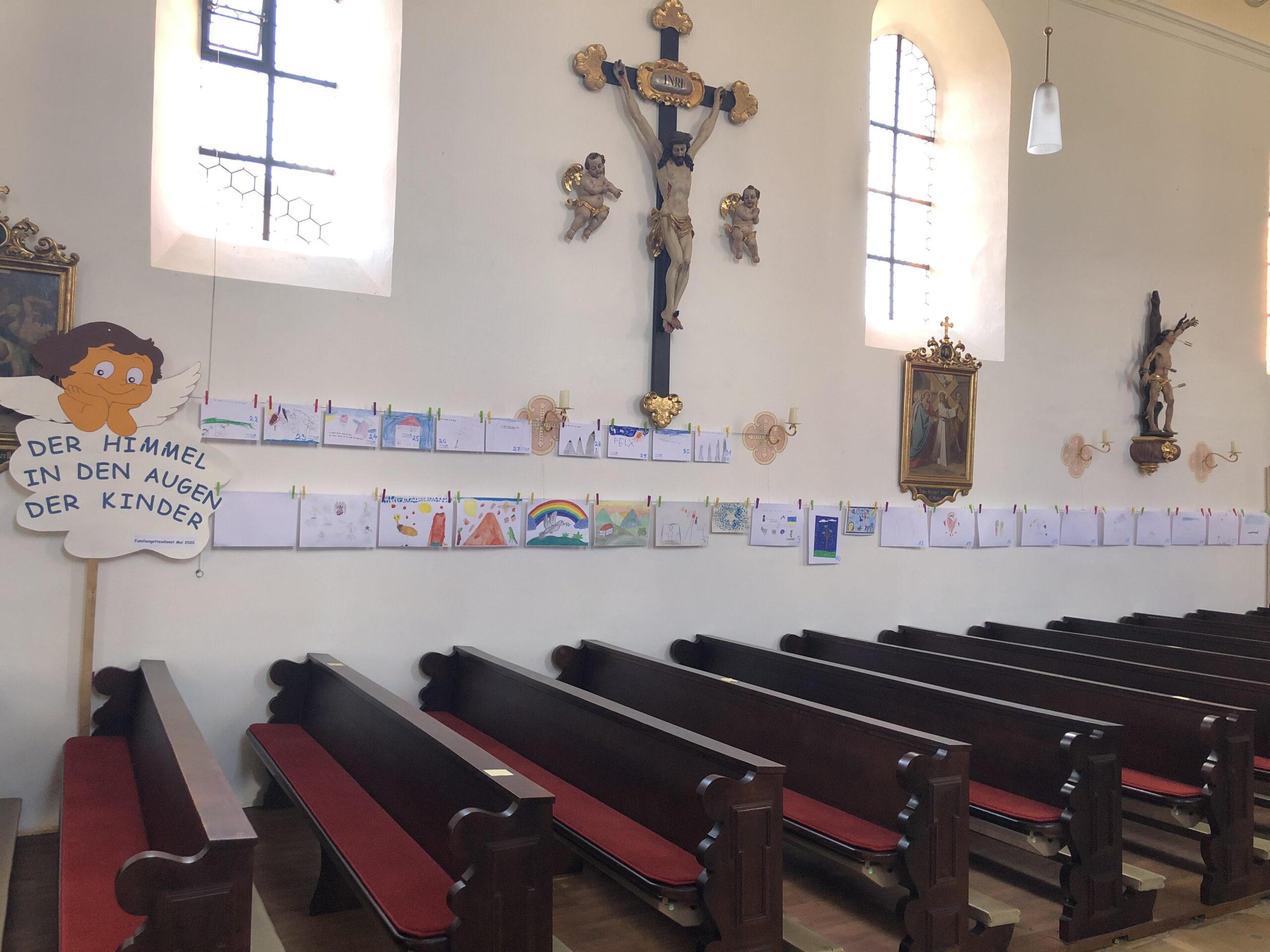Bilder von Gemeinschaft und Geborgenheit waren in den Kirchen zu sehen. Bilder, die den geliebten Opa zeigen, wie er durch den Himmel fliegt, oder den Chor der jauchzenden Engel. Friedenstauben und Regenbogen wurden dargestellt als Symbole für Frieden und Heil, aber auch ganz konkrete Tätigkeiten wie Bulldogfahren und Skifahren waren zu sehen.